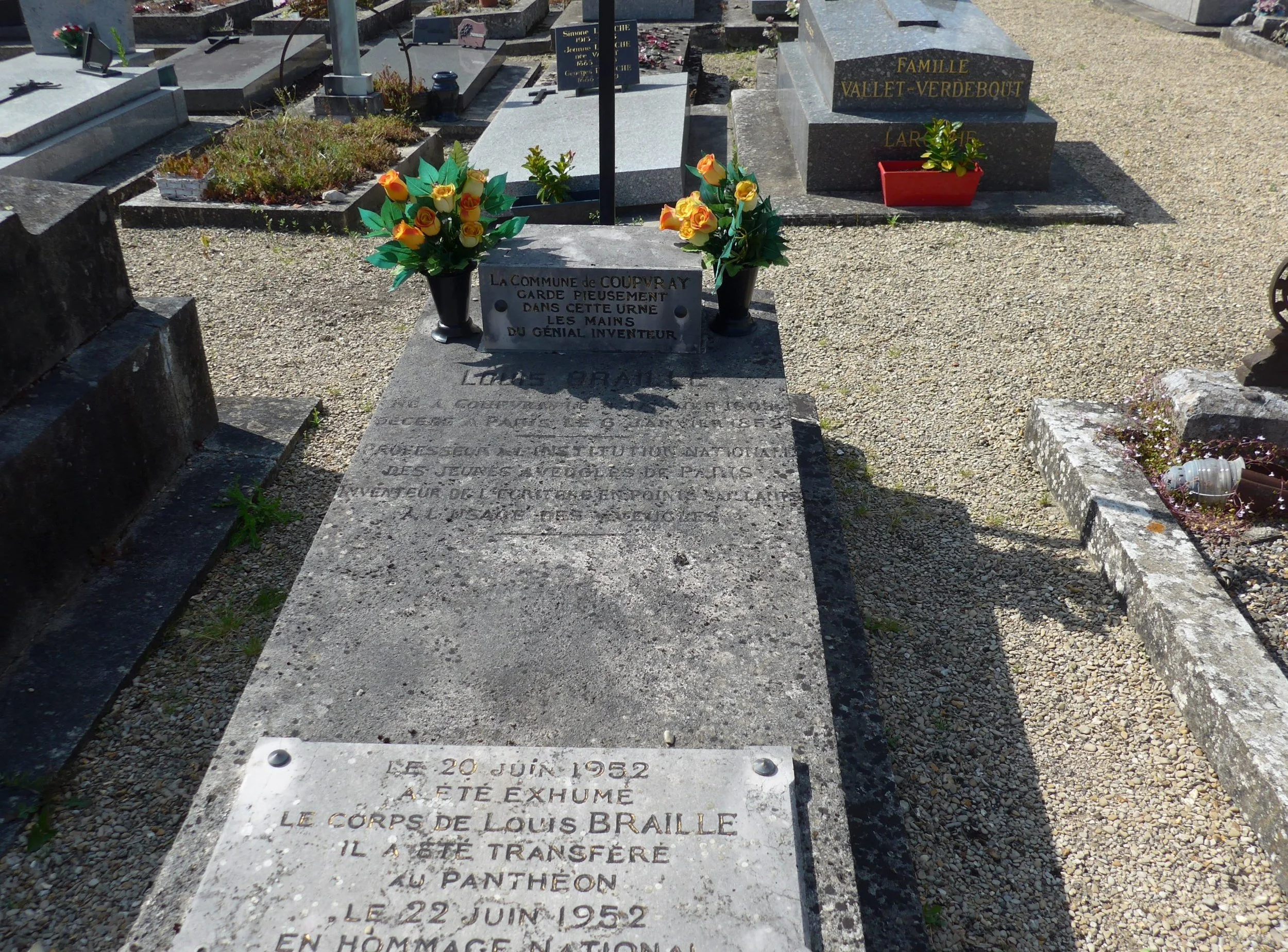 Braille (1809-1852) was initially buried here but his remains were transferred to the Panthéon in Paris in 1952. However, the village obtained permission to keep his hands, which are interred in the rectangular box on his tomb.