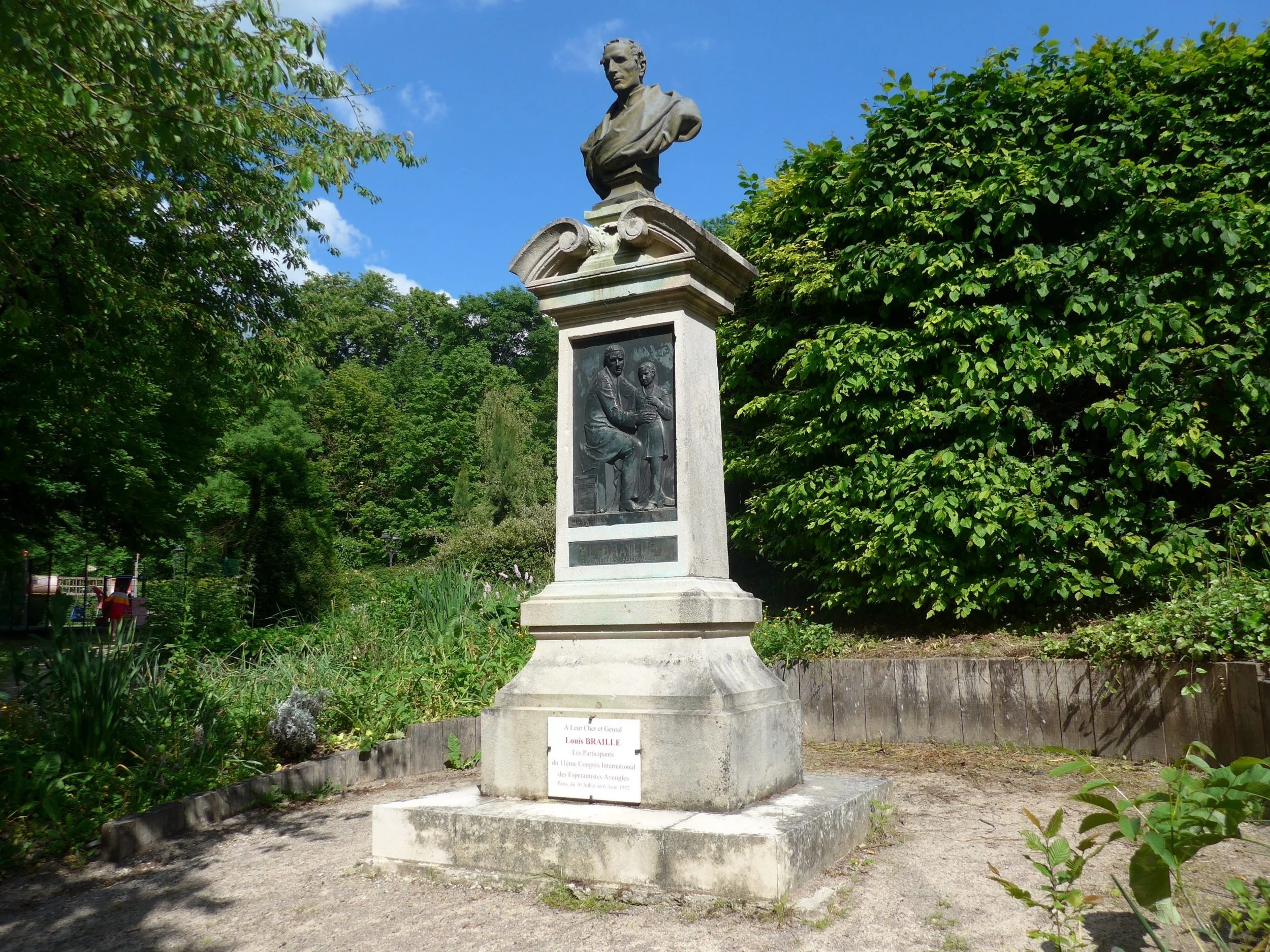 Turn left from the church entrance, go round it and back up to the road which leads to the lavoir (wash-house) straight ahead. Keeping the lavoir on your left follow the path to the cemetery. You will pass a monument to Louis Braille in a small garden at the end of the path on the left, put up in 1887.