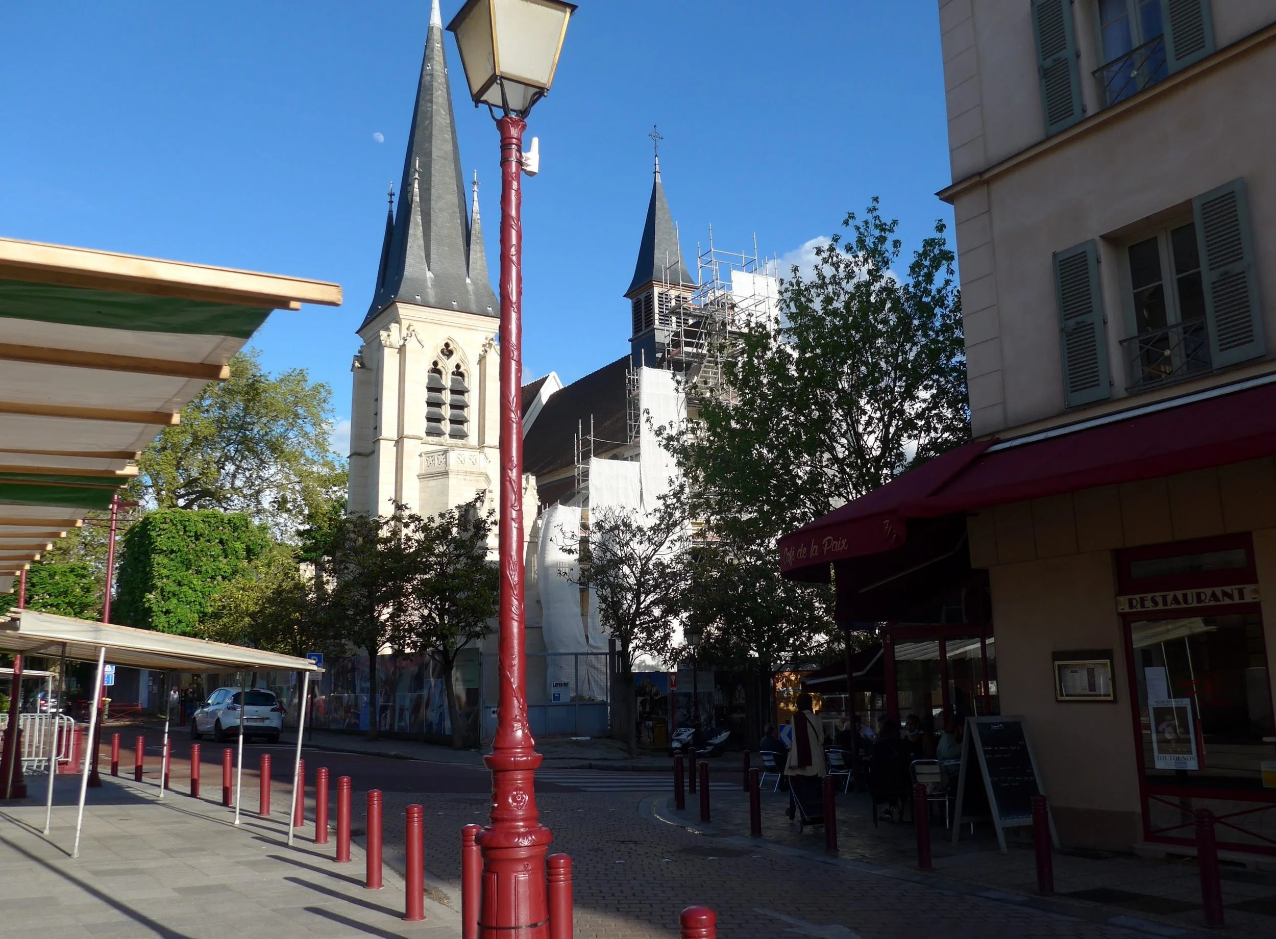 The exit from the Petit Château is currently closed, so turn left from the carp pond to leave the park by the Entrée Eglise. Turn left, past the church which is also being restored. This part of Sceaux contains several cafés and has a very attractive, village-like atmosphere.