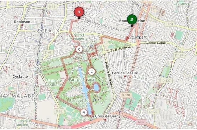 7 km walk from Bourg la Reine to Sceaux, OpenStreetMap. A = Arrive, D = Depart, ② = 2 km